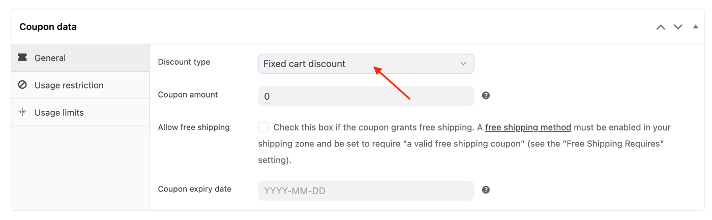 Fixed cart discount — A fixed total discount for the entire cart. For example, if the cart contains 3 shirts @ RM20 each = RM60, a coupon for RM10 off gives a discount of RM10.