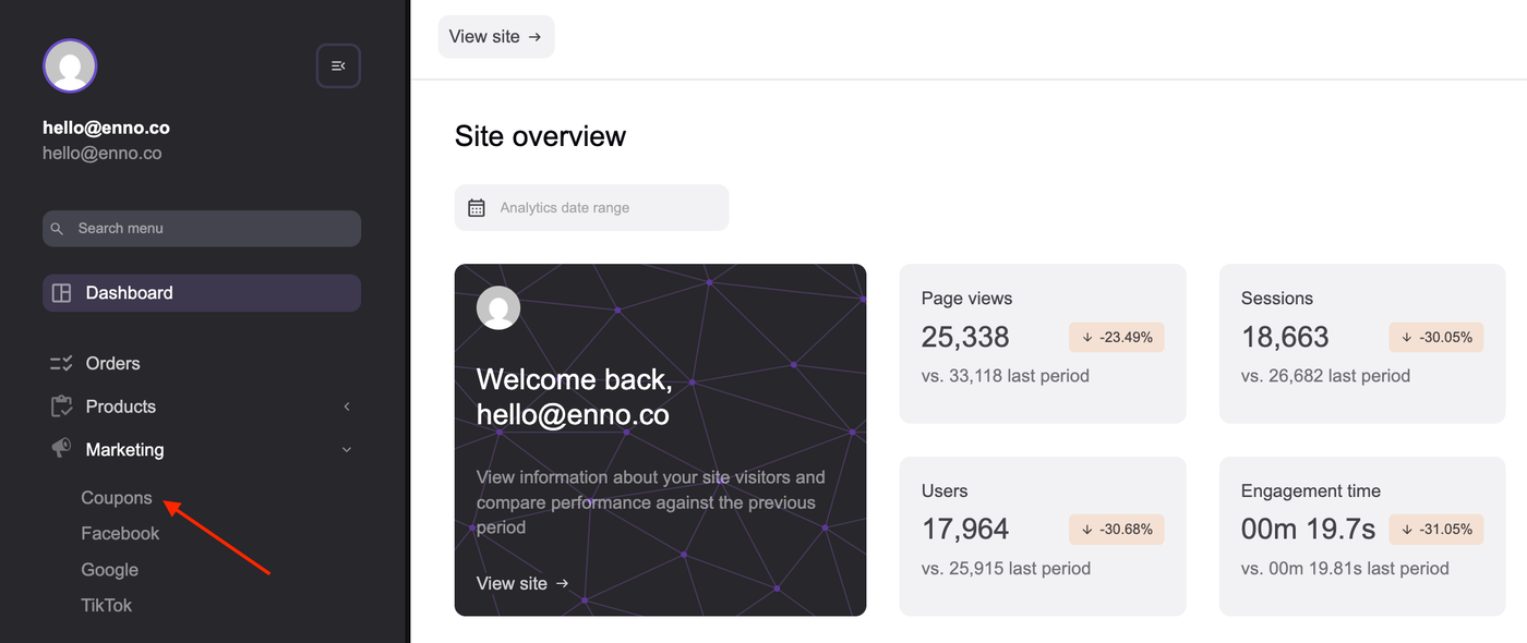 To get started, login to WebPanel and navigate to Marketing > Coupons.