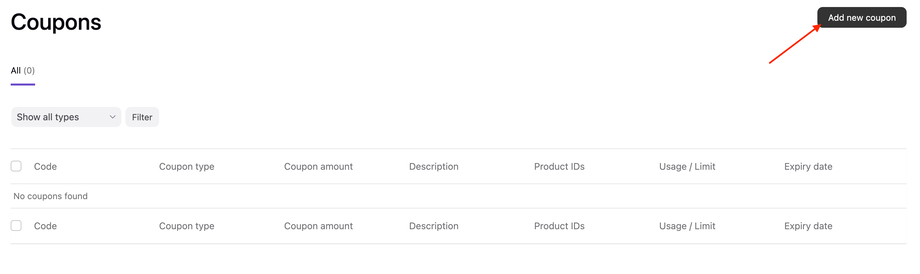 Usage limit per coupon — Each coupon has a usage limit indicating how many times all customers can use it before it becomes invalid.