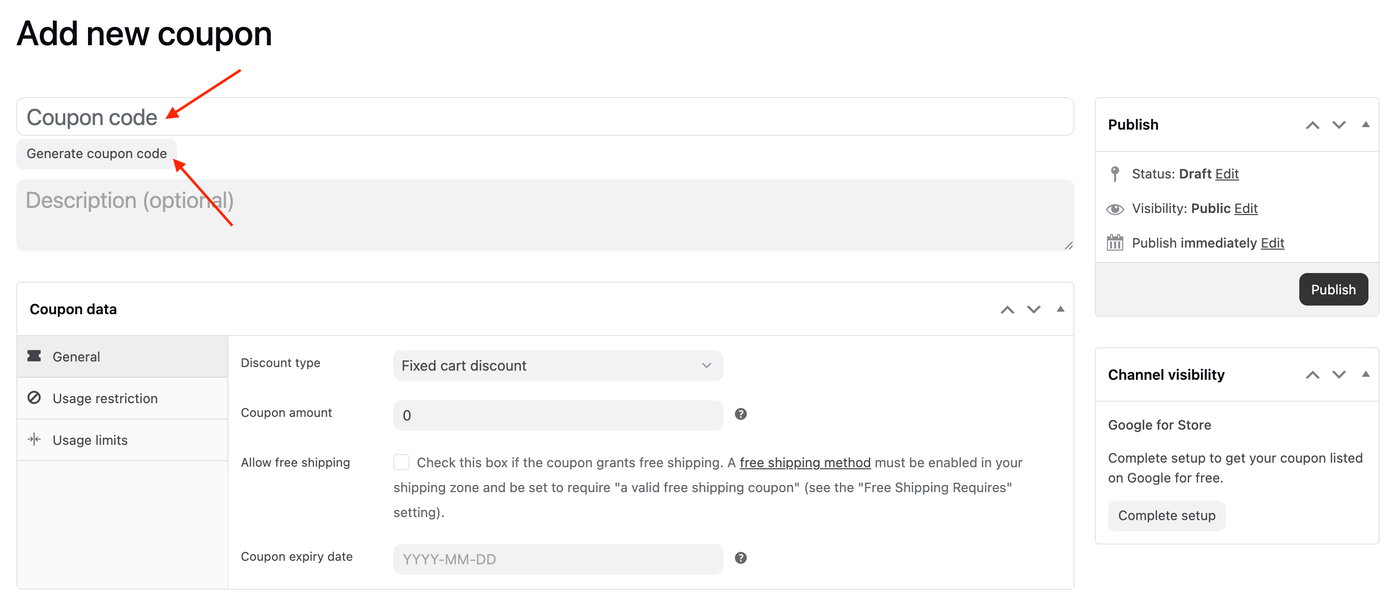 2. Enter or generate a random Coupon code. This is the code your customers use on the cart or checkout pages to apply the discount.