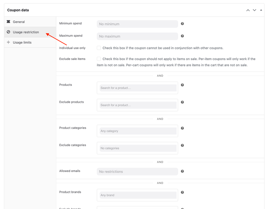 Product categories — The coupon applies to only these categories or requires specific categories in the cart for the discount to apply.