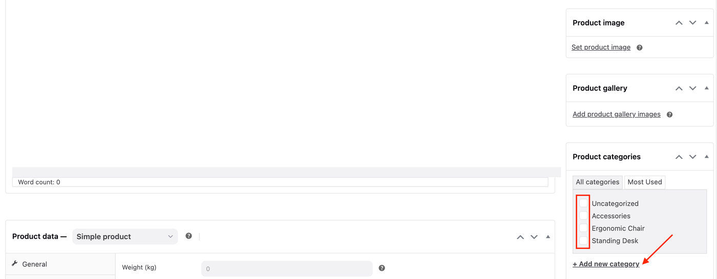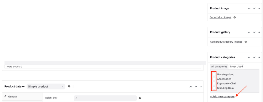 9. (Optional) In the Product categories panel, select the appropriate categories or + Add new category.